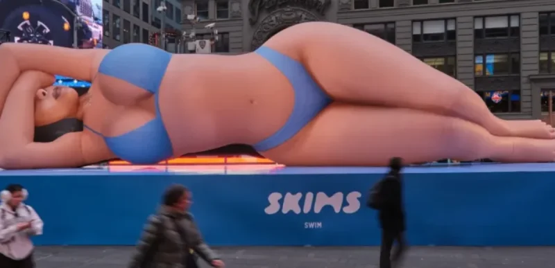 Кім Кардашʼян знову привернула увагу, цього разу завдяки 20-метровій надувній фігурі, що з’явилася в самому серці Нью-Йорка, на Таймс-сквер. Гігантська копія зірки, одягненої в блакитне бікіні, стала частиною рекламної кампанії нової колекції купальників її бренду Skims Swim.